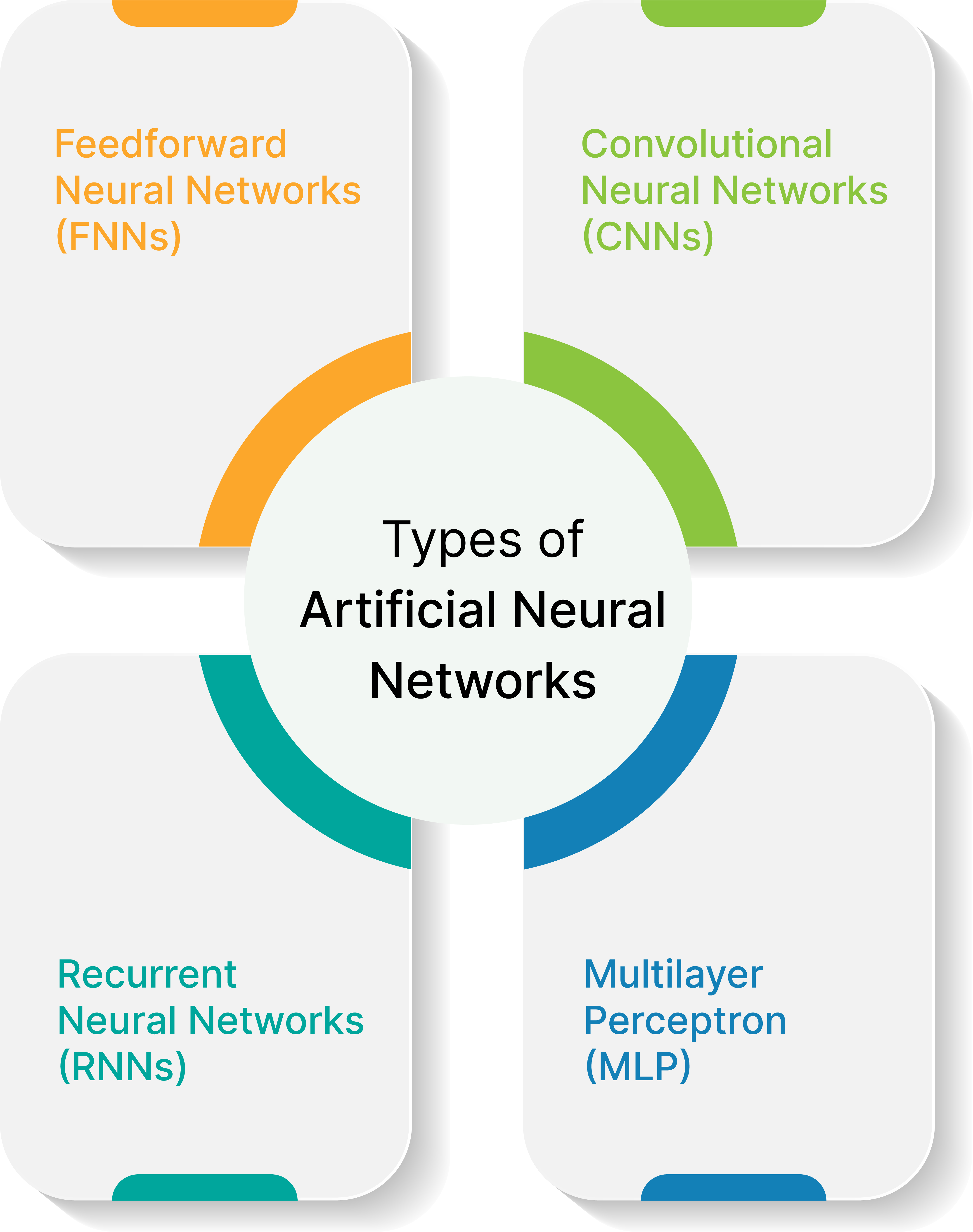 4. Multilayer Perceptron (MLP): MLP is a type of feedforward neural network with three or more layers, including an input layer, one or more hidden layers, and an output layer. It uses nonlinear activation functions.