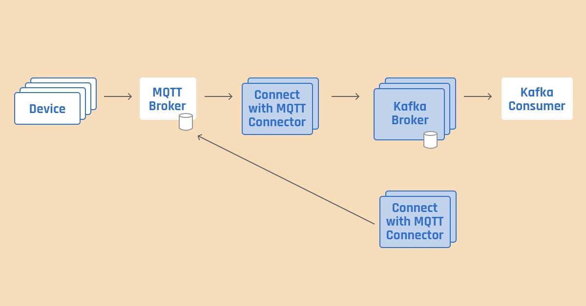The MQTT broker is persistent and consumes push data from IOT devices which Kafka Connector later pulls at its own pace. Hence, neither the Kafka Connector gets overwhelmed by the data source nor overwhelms the source.