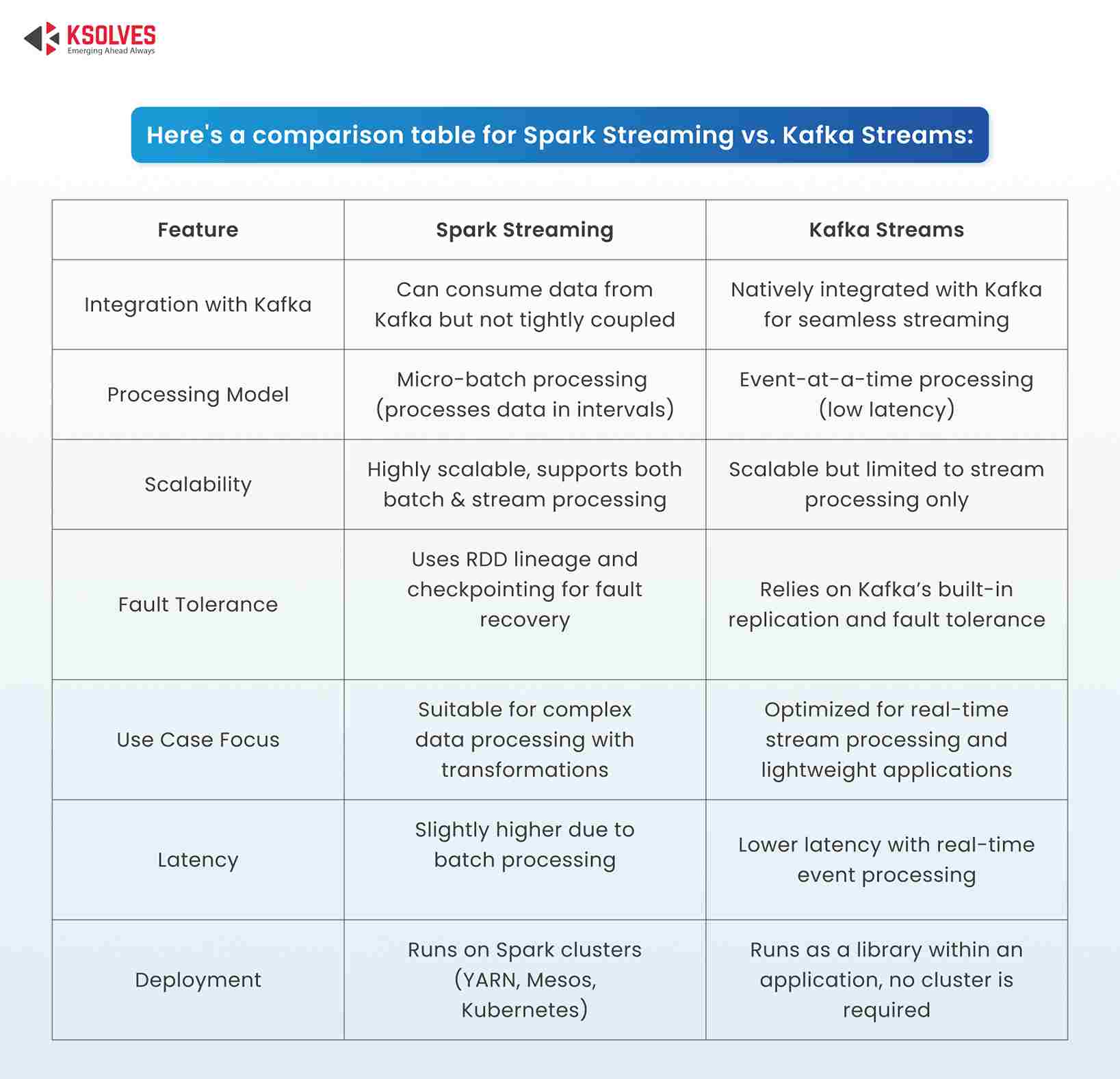 Here’s a comparison table for Spark Streaming vs. Kafka Streams:
