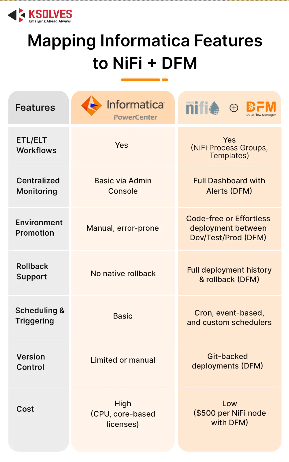 Now, when the Informatica PowerCenter support is ending soon, many businesses are looking for smarter, more flexible alternatives. Apache NiFi + DataFlow Manager (DFM) offers an open-source ETL solution thatโs faster to deploy, easier to manage, and built for modern data needs. Discover why enterprises are making the switch, see real-world results, and learn how Ksolves ensures a seamless, low-risk migration.