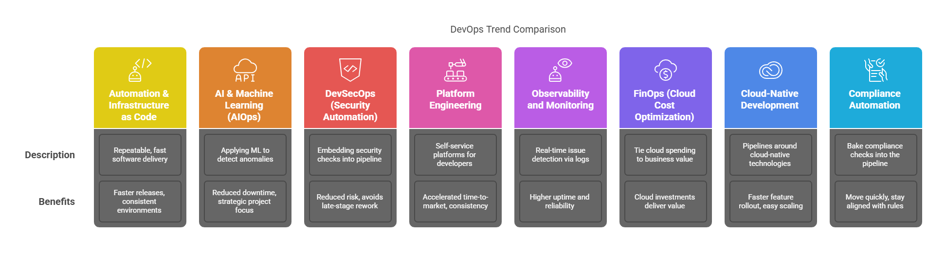 DevOps – the practice of combining development and IT operations – has become mainstream. Recent surveys show that nearly three-quarters of organizations have adopted DevOps practices, and 86% of IT leaders say that rapid software releases are important. This cultural shift drives faster delivery, higher quality, and greater agility. In 2025, new technologies will shape DevOps: automation will go deeper, AI/ML will help operations (AIOps), security (DevSecOps), and compliance will be built in, and cloud platforms and cost tools will be critical. Below are eight trends business leaders should watch.