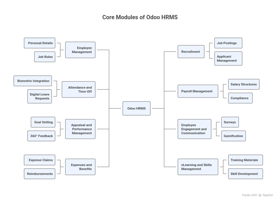 Odoo HRMS isnโt just a tool for managing employees. It is a complete ecosystem that connects every HR process, from onboarding to performance management, under one unified platform. Letโs explore the key modules that make it so powerful: