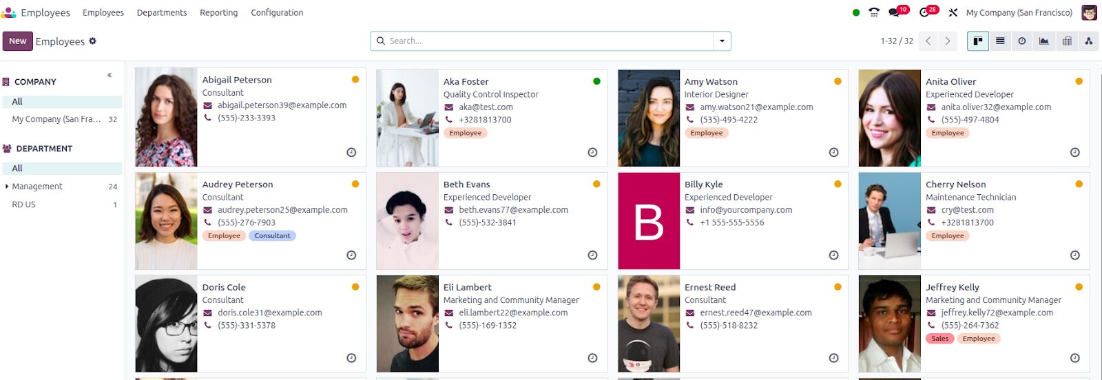 This is the backbone of Odoo HRMS. It centralizes all employee information, from personal details and job roles to contract types and work history, into one dashboard. HR teams can quickly access profiles, track organizational structure, and maintain complete transparency across departments.