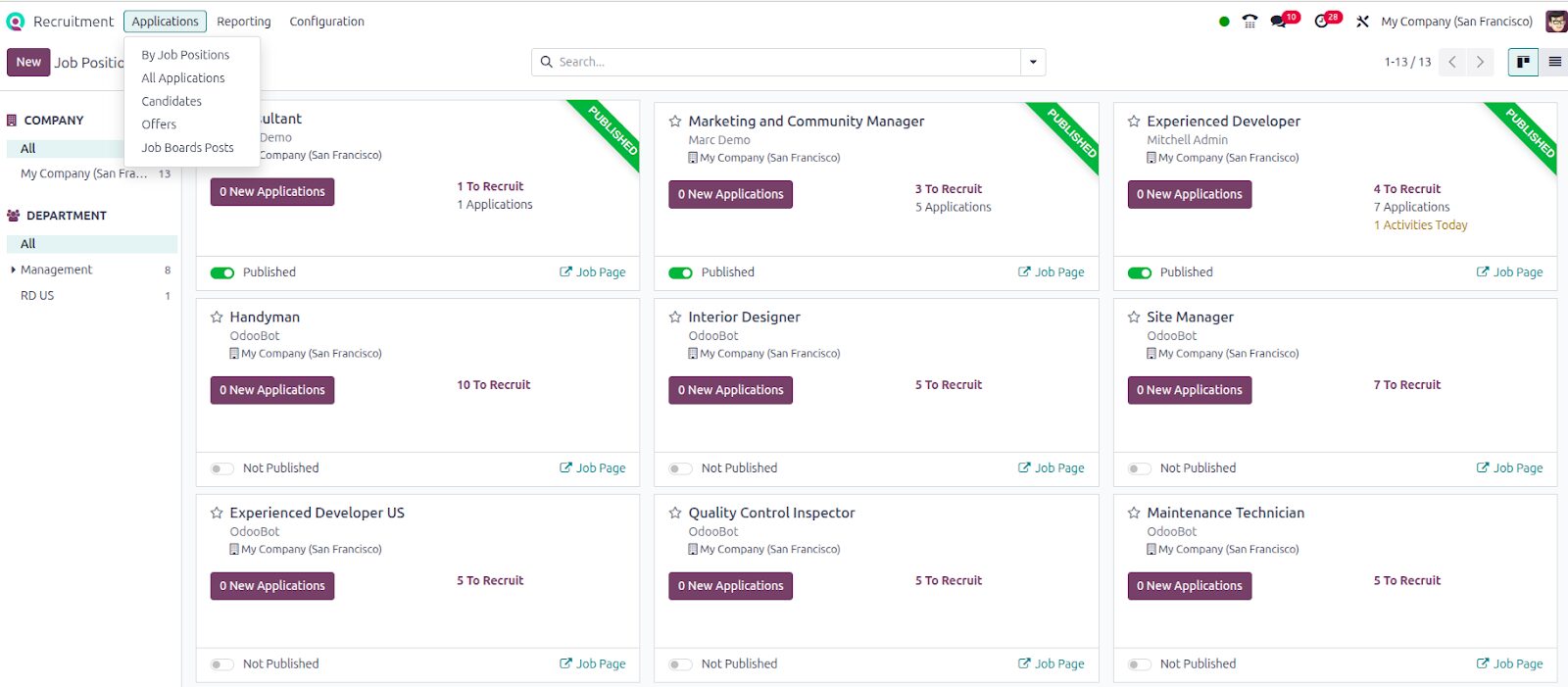 Odoo streamlines the entire hiring process, from posting job openings to final onboarding. Recruiters can create job positions, manage applicants through customizable stages, schedule interviews, and generate offer letters โ all from within the system. Integrated email and calendar features ensure no communication falls through the cracks.