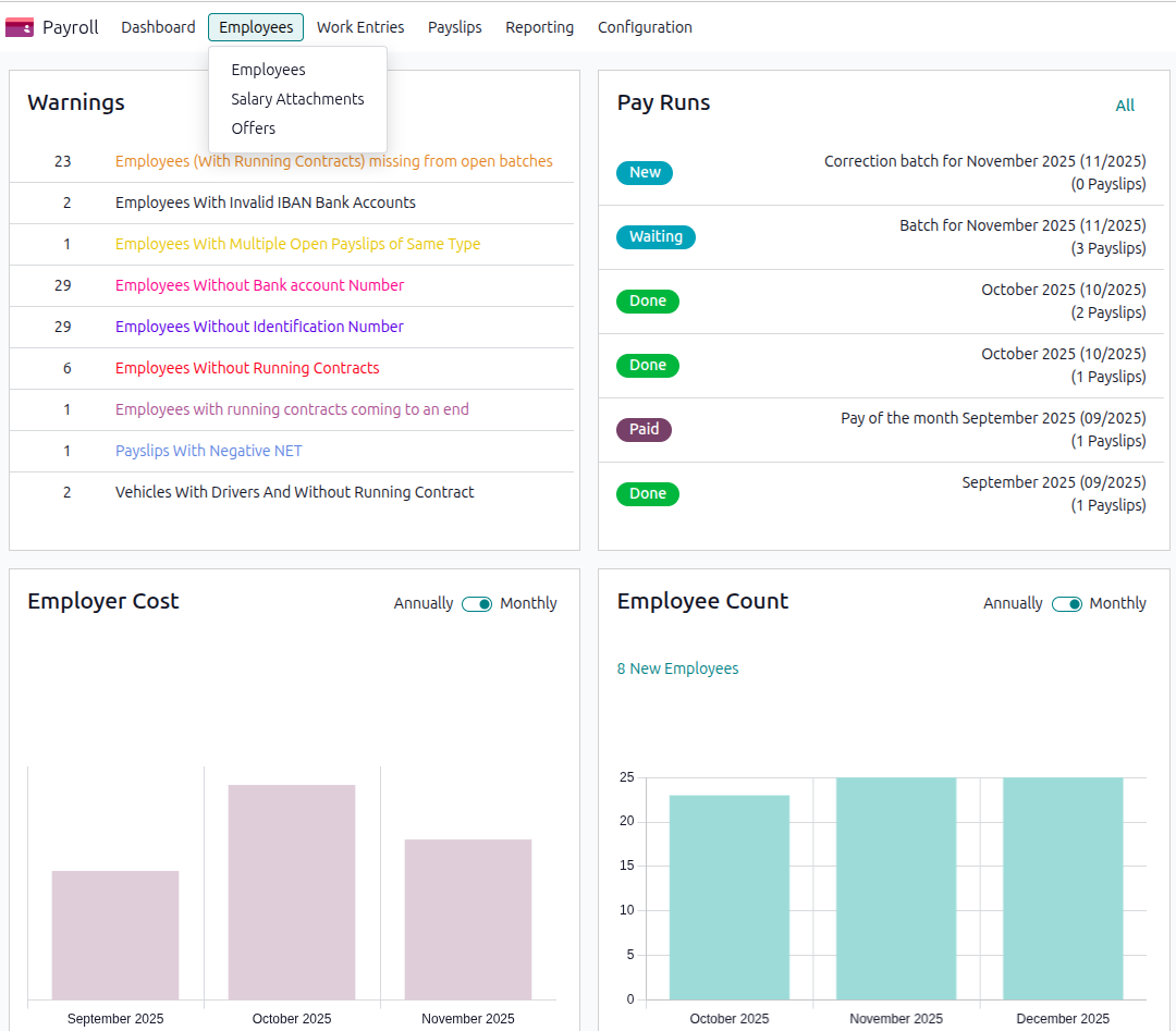 With built-in compliance for local labor and tax regulations, Odoo helps businesses avoid payroll errors and legal risks. The automated payroll workflow enables faster salary processing, secure payslip generation, and transparent salary management, resulting in error-free payroll cycles and improved employee trust.