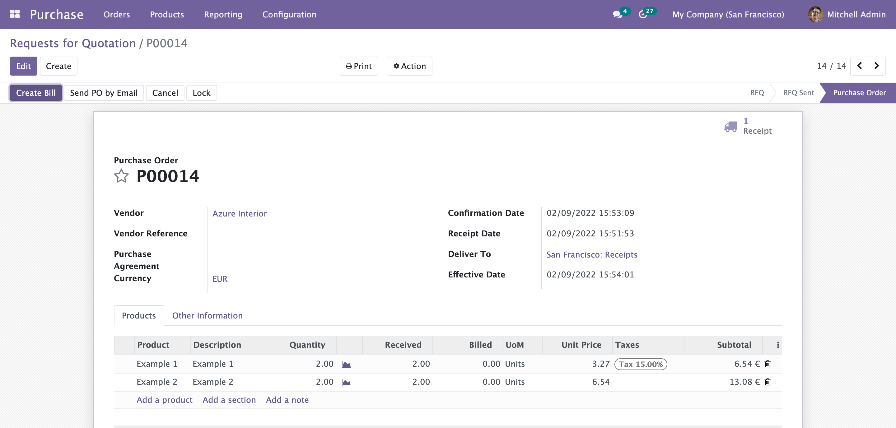 Now as you can see the Quotation of your order has been created. You will get a purchase order number, for example, here it is ‘P00014’.