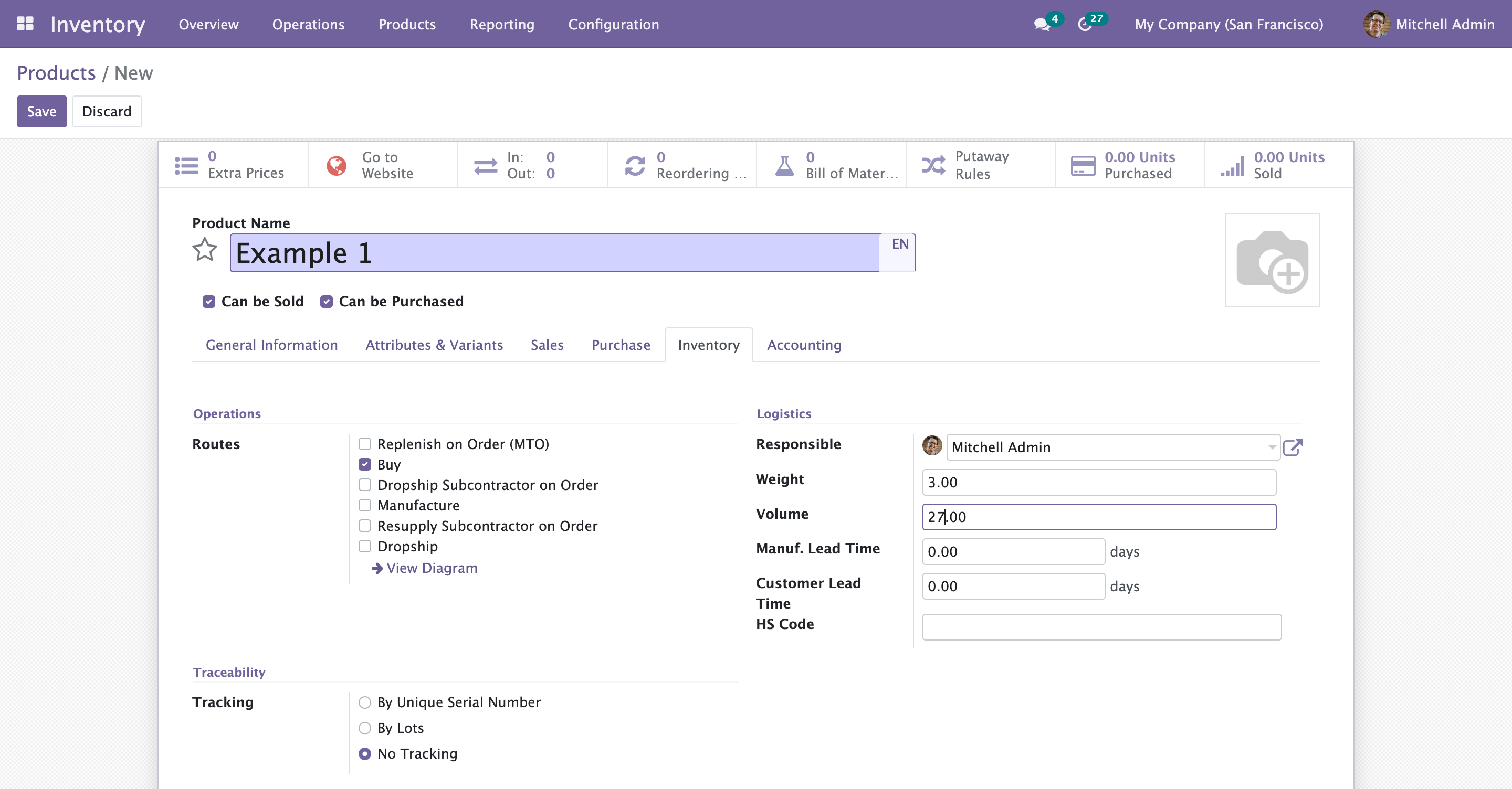 Now, in the ‘Inventory’ section, you can set the weight and volume of the product if required. After filling in all the necessary information, click on the Save button.