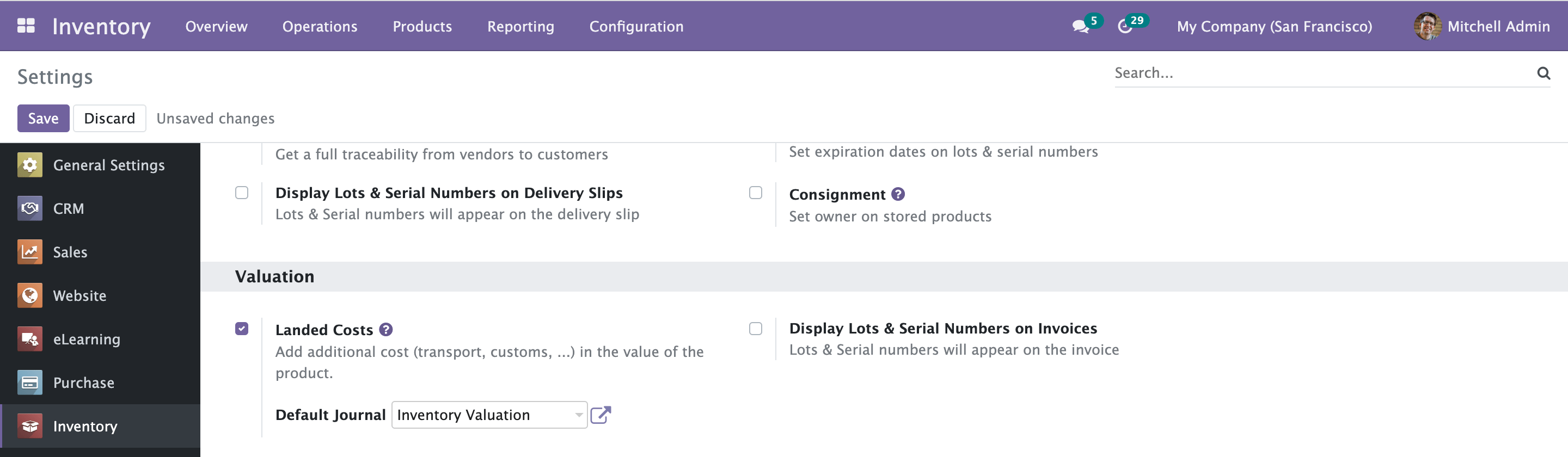 Go to Inventory>Configuration>Settings>and go to the ‘Landed Costs’