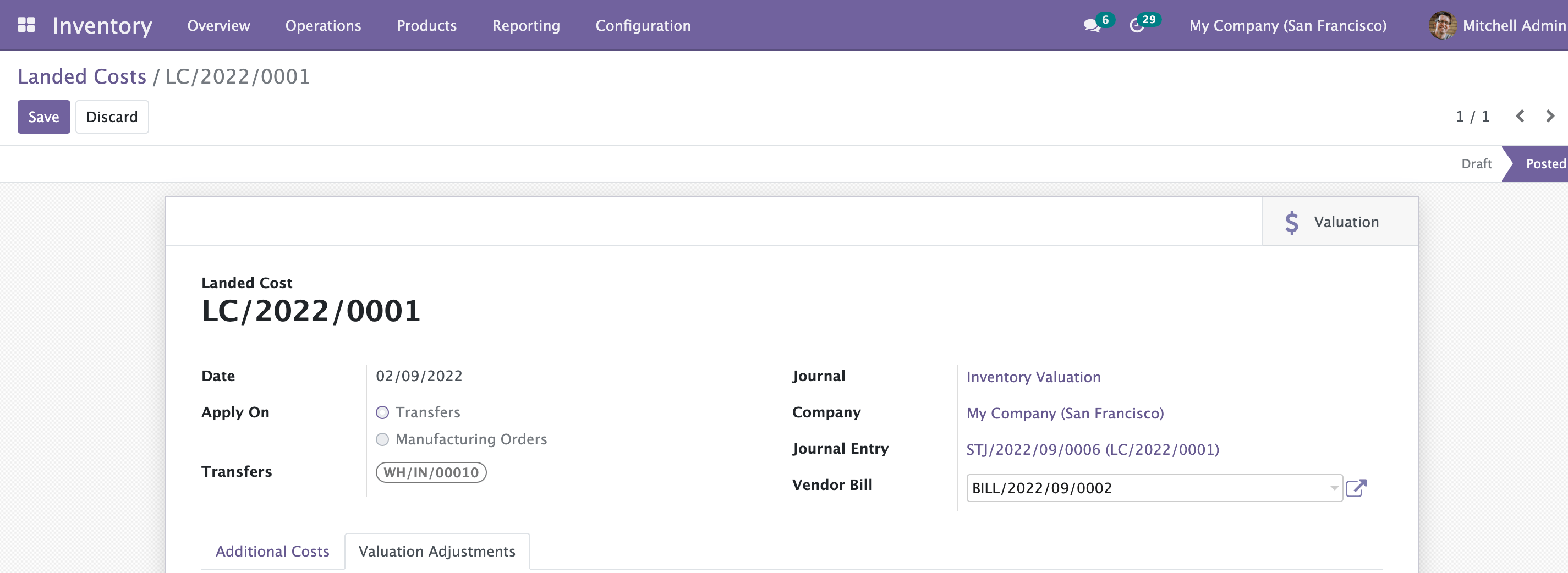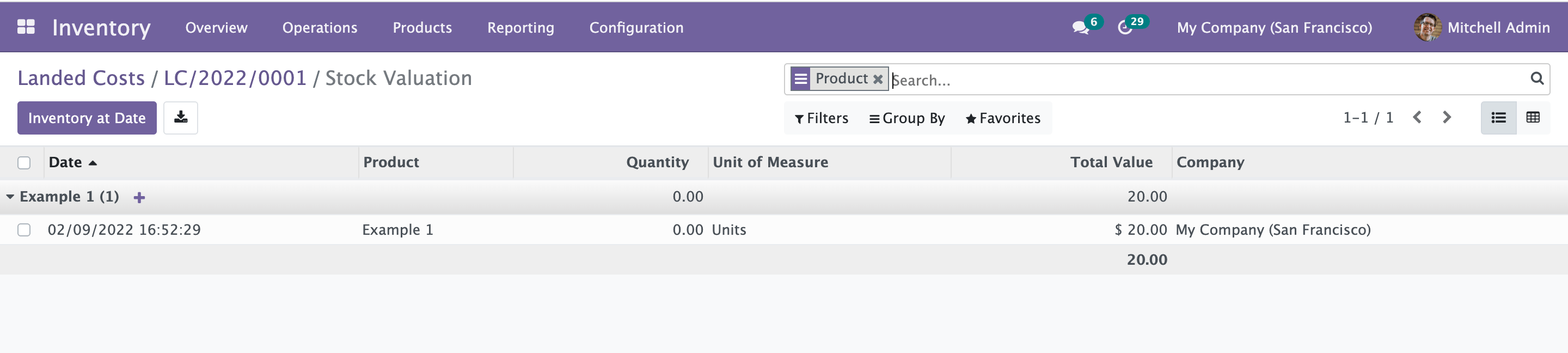 In the right corner, you will see the ‘valuation’ option. Click on that option to see if the landed cost has been applied to the product (Example 1).