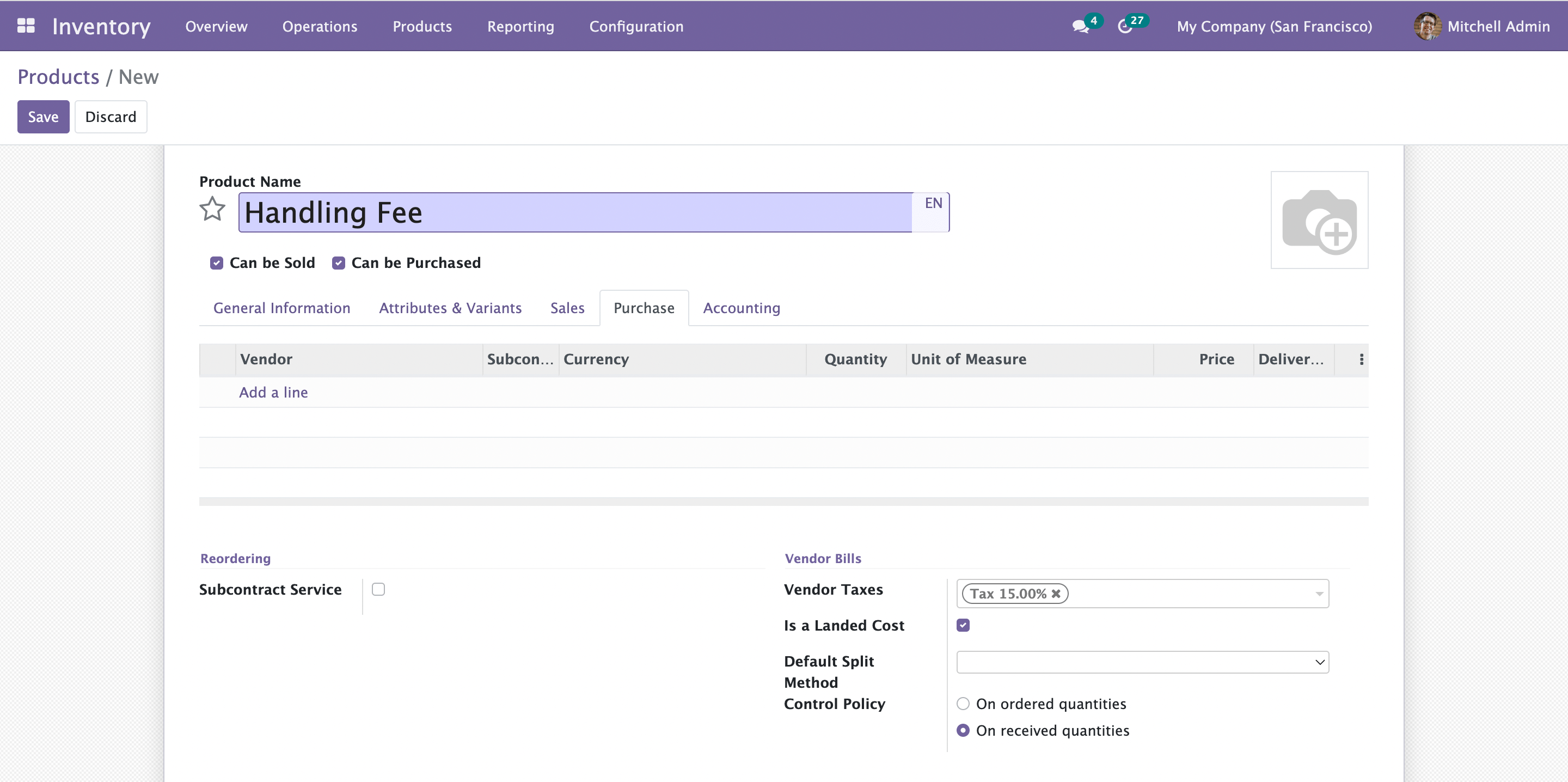 In the ‘Purchase’ section, check the ‘Is a Landed Cost’ option to calculate the landed cost of the purchased product.