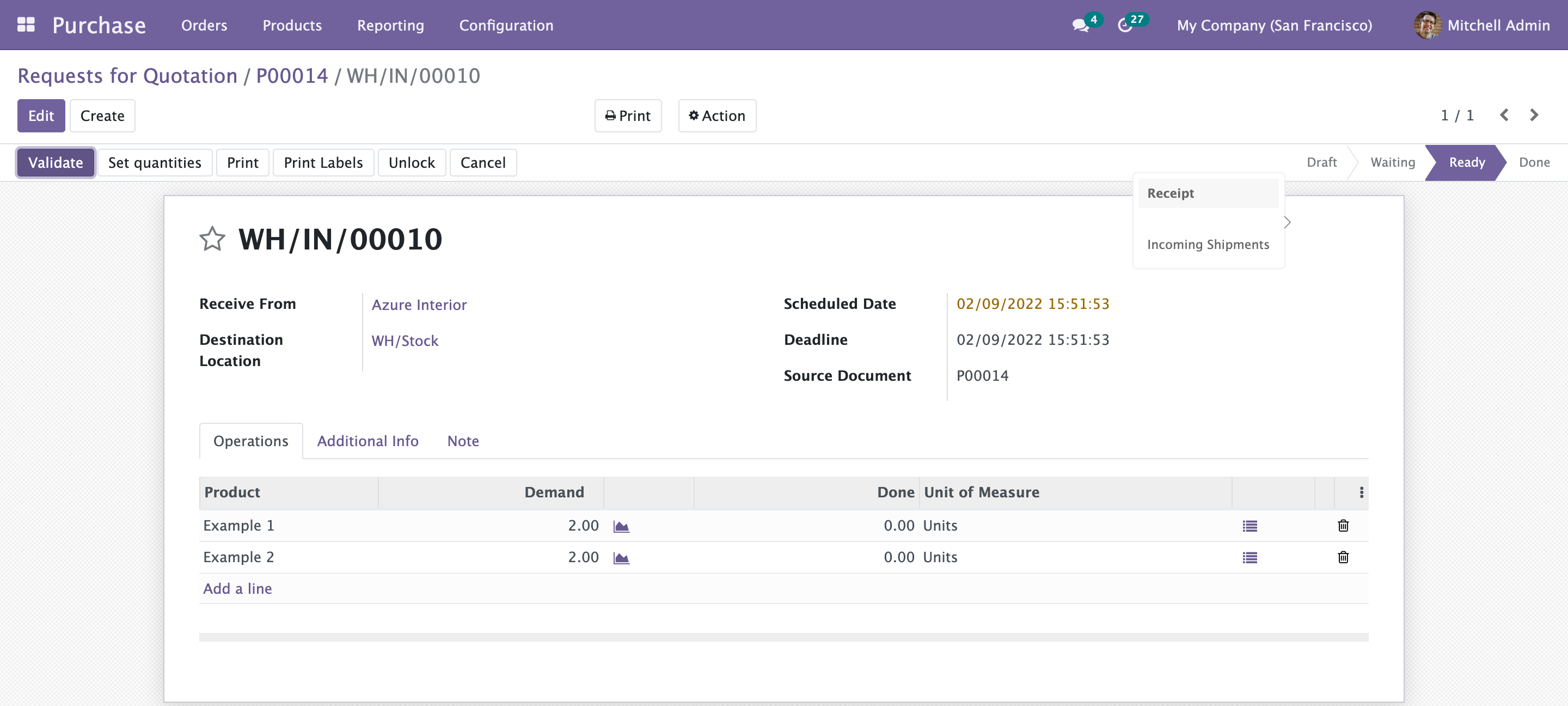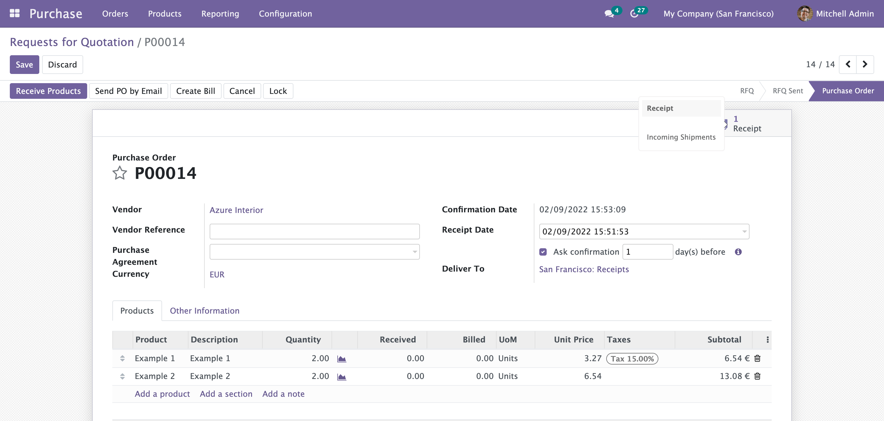 Now in the right corner, you will find an open, ‘Receipt’, click on it to create the quotation of your purchase order.