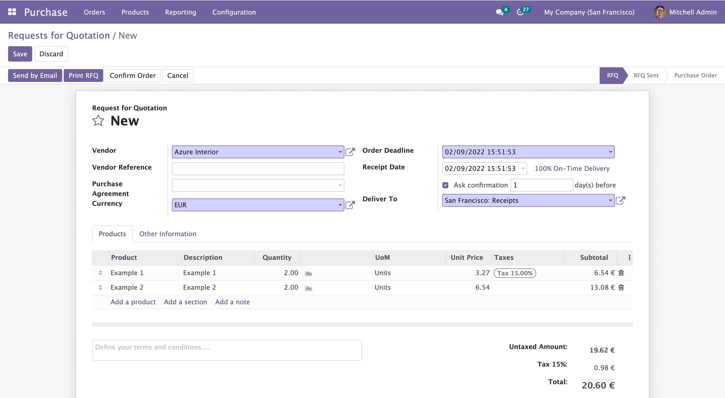 Fill in the vendor, order deadline, receipt date, and add the products you want to create a purchase order for.