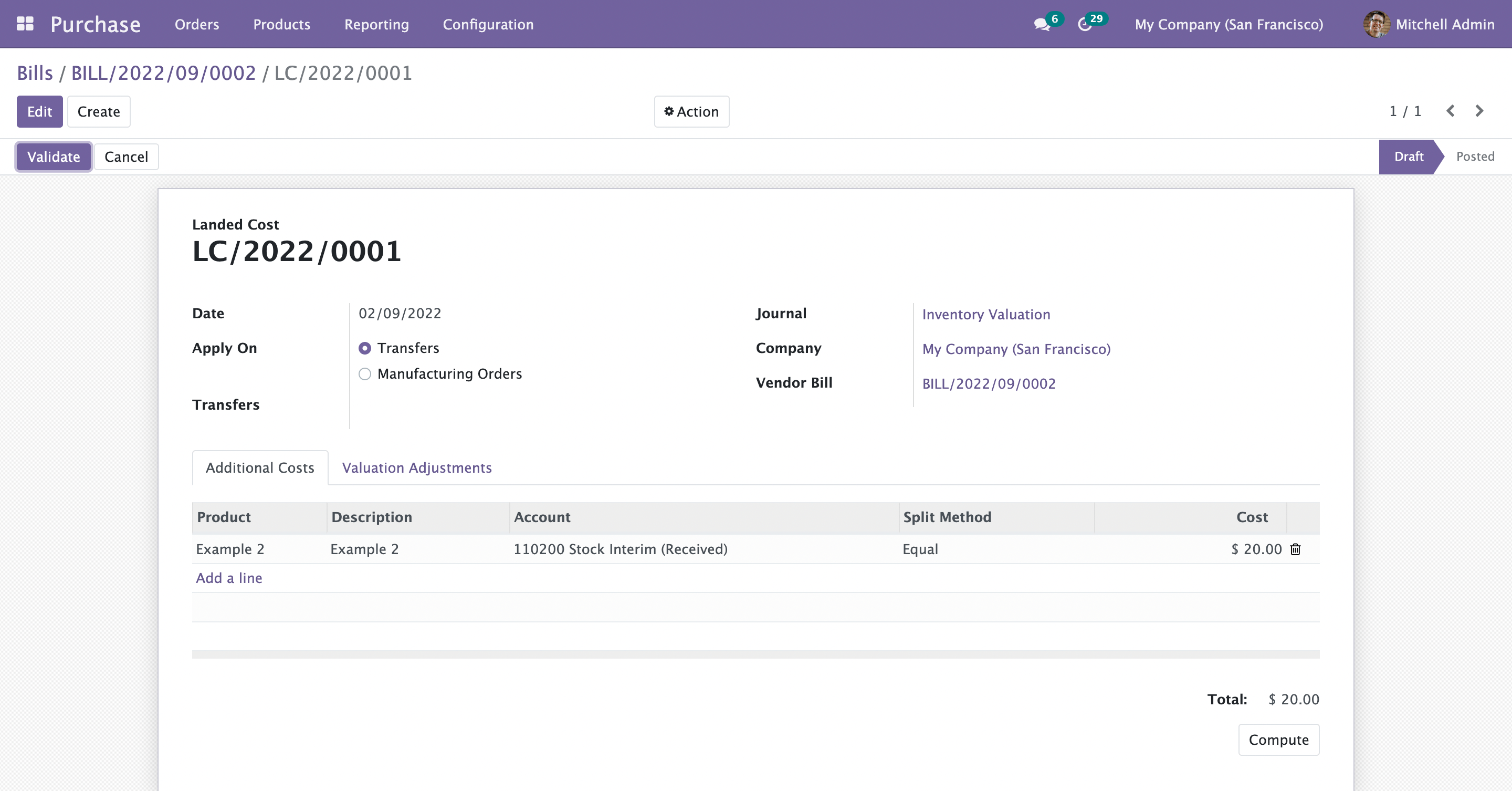Now, you will get a window as given below. Click on the ‘Create Landed Costs’ button that will help you to find the landed cost on your shipping orders.