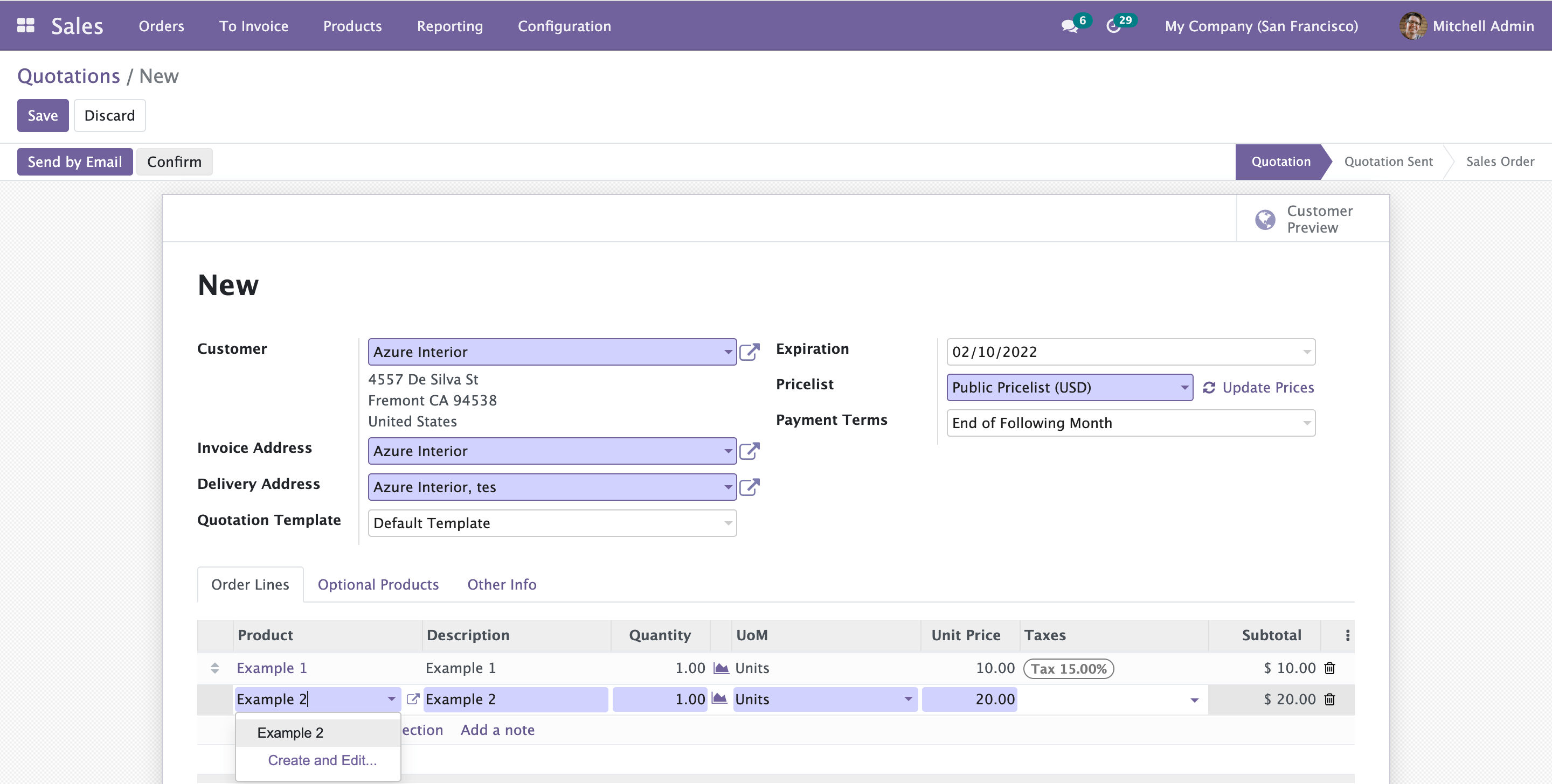 Fill in the customer name and add the products. Click on the confirm button and the quotation window will appear as given below: