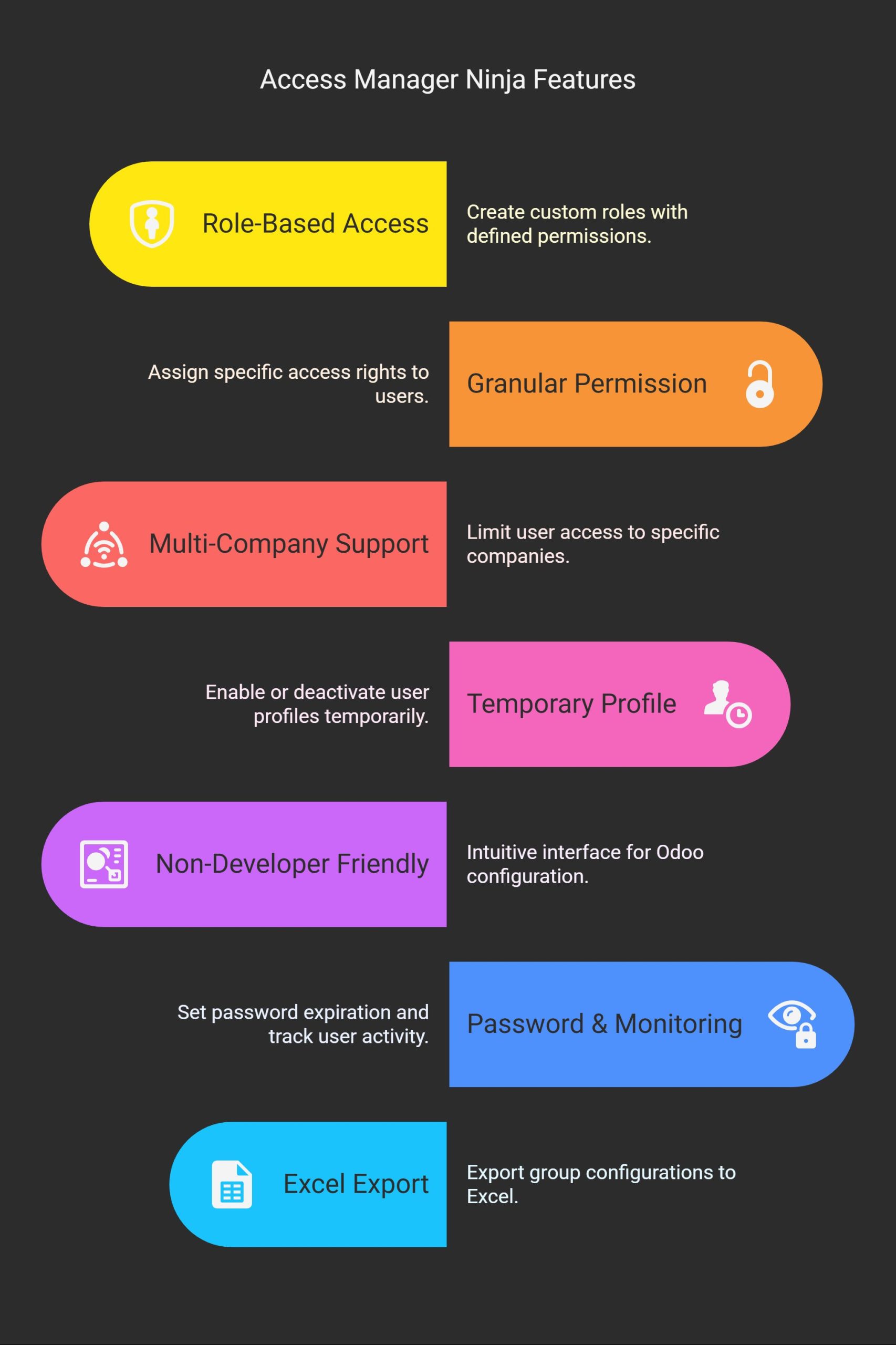Access Manager Ninja offers a comprehensive set of tools to manage user access in Odoo ERP effortlessly. Here are its standout features: