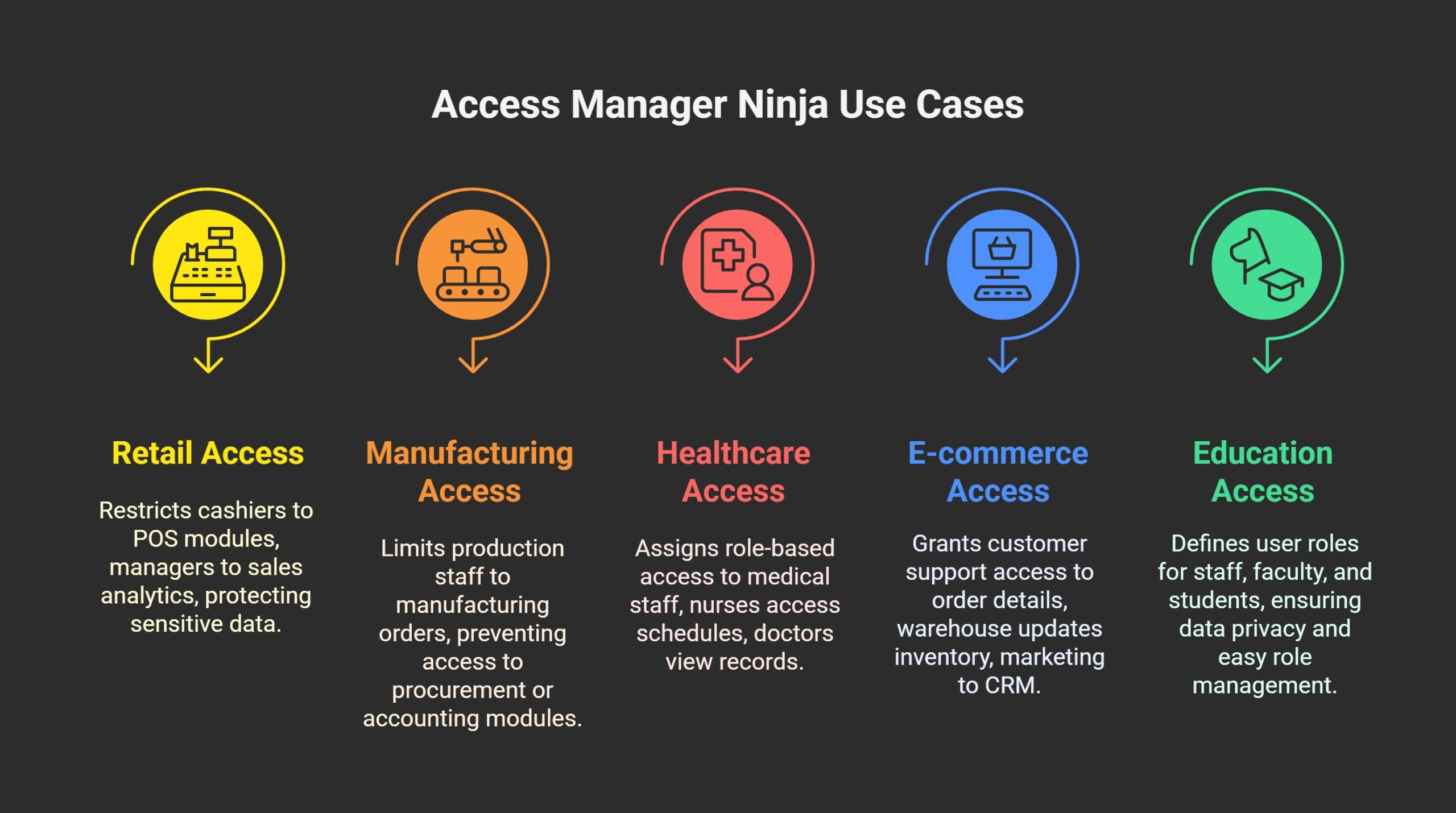 Access Manager Ninja adapts seamlessly to diverse industries, enabling businesses to tailor Odoo employee access levels and implement role-based access in Odoo to meet specific operational and security needs. Below are real-world scenarios showcasing how this module enhances Odoo access management across various sectors:
