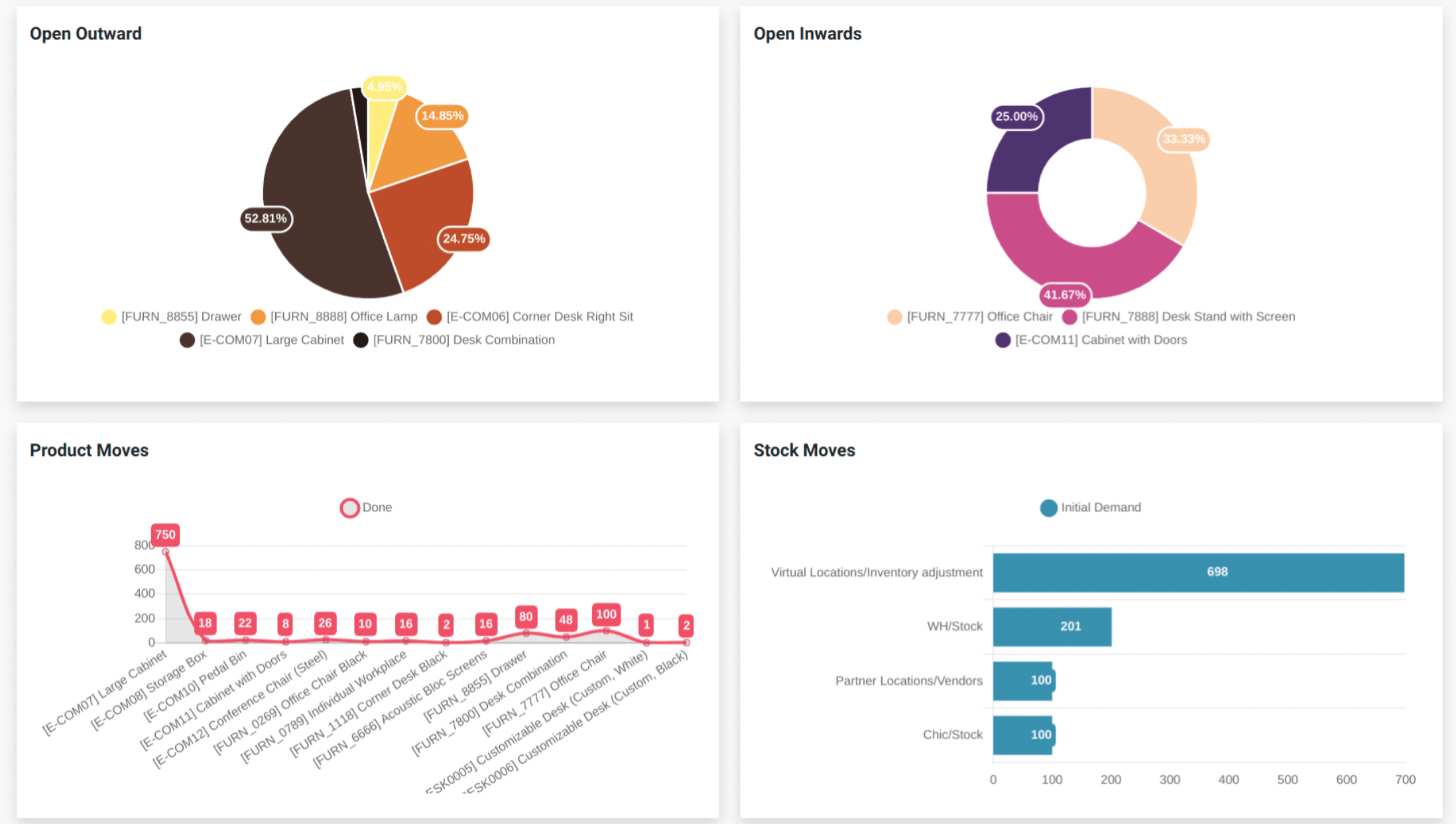 Odoo ERP Inventory Module helps supplement industries to keep records of their quantities, selling items, and more. Moreover, you can convert your clumsy inventory data into beautiful charts for easy readability.