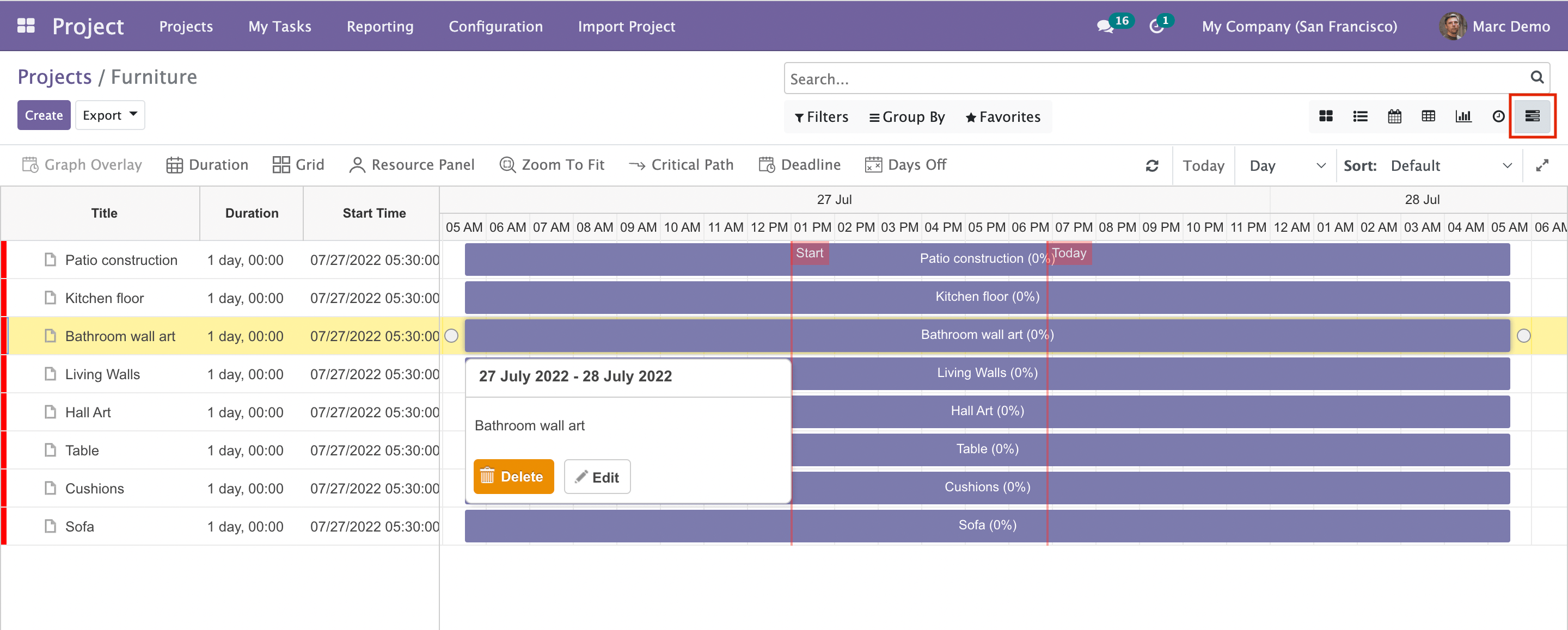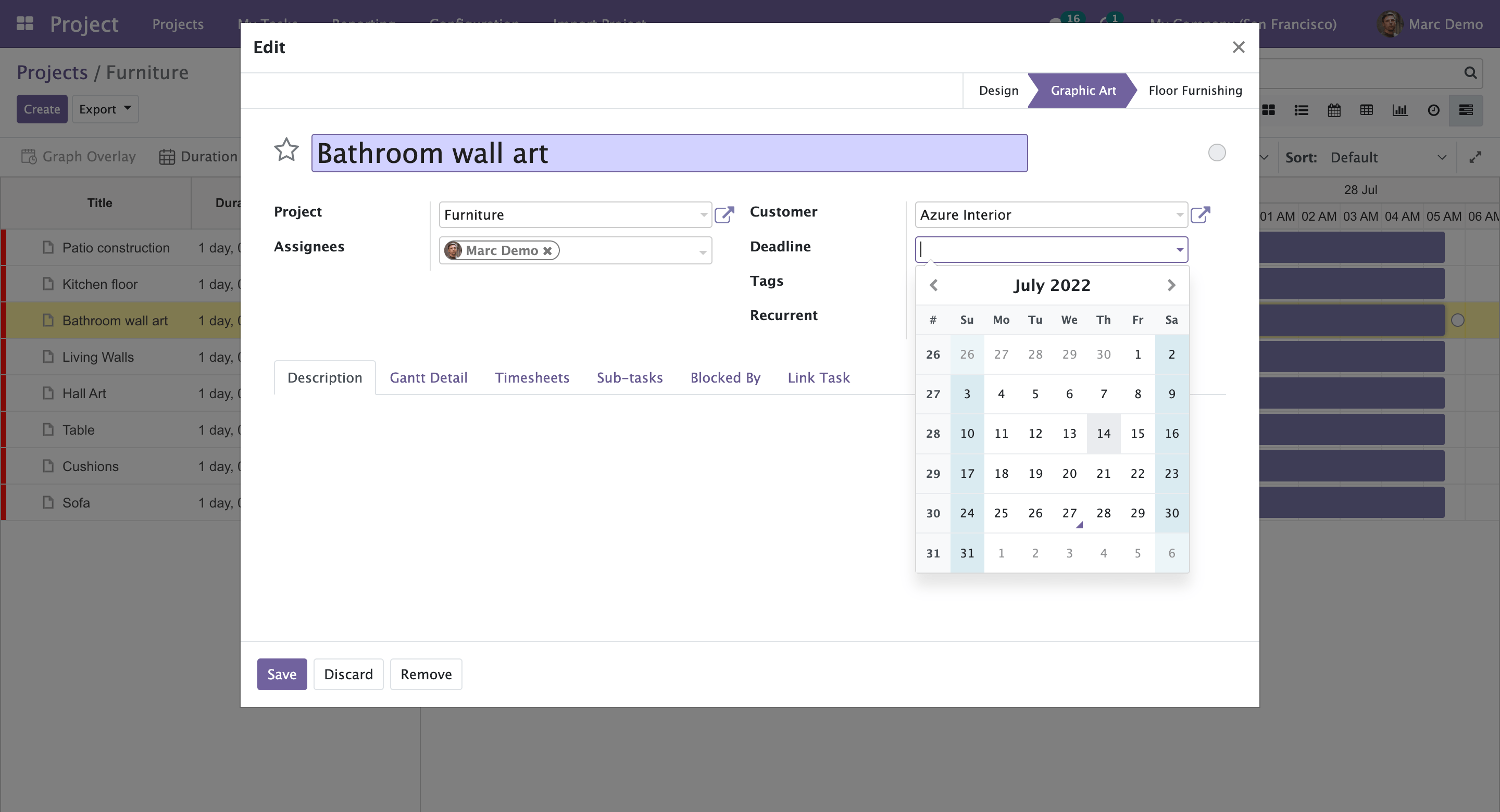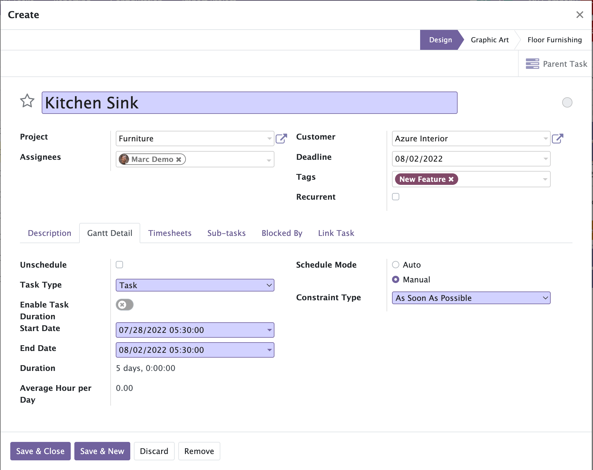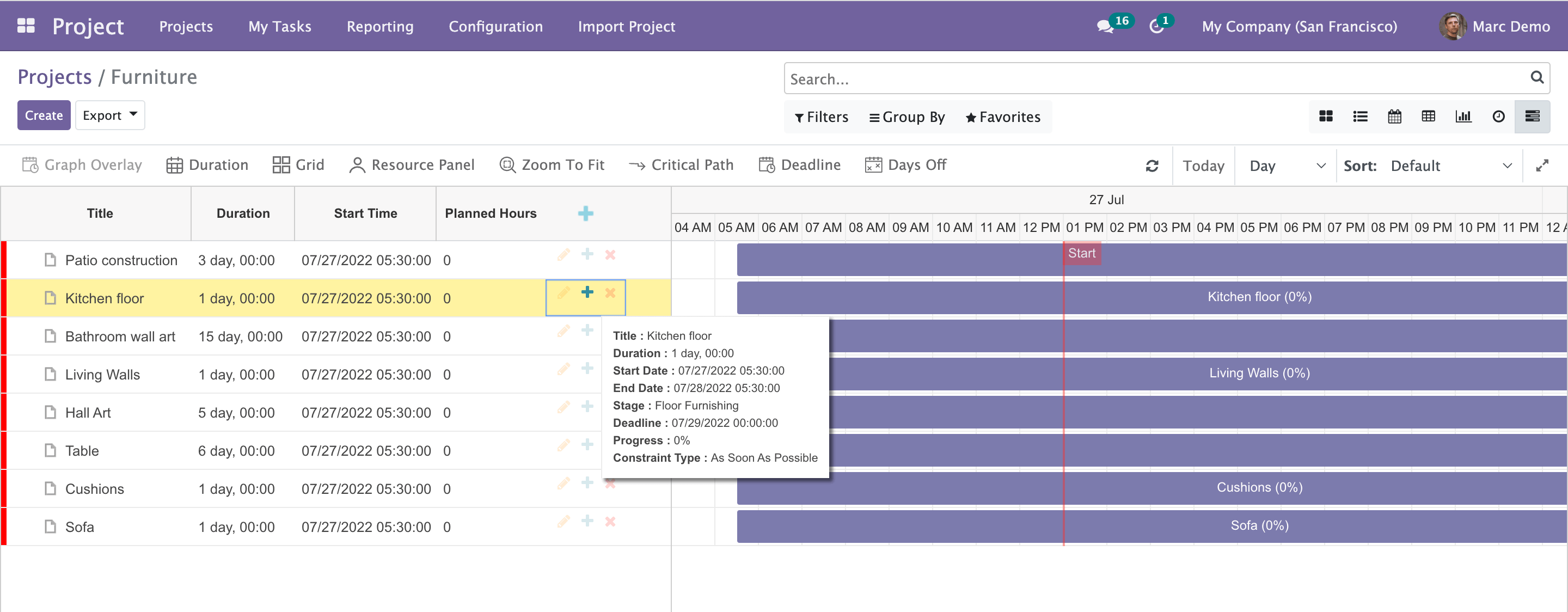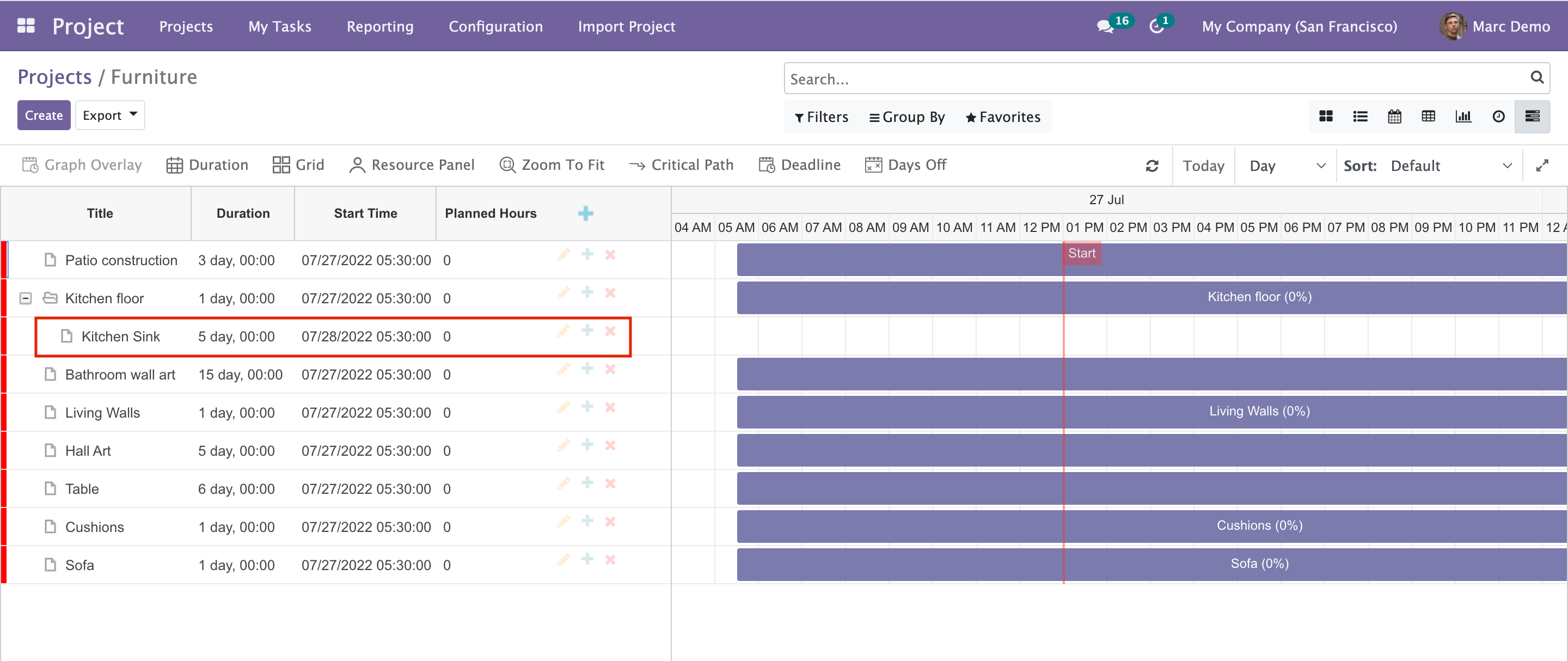 With Odoo Gantt View Project, you can create sub-tasks for your project. For instance, while working on the Kitchen part for your private home suite business, you can break the task into multiple tasks.