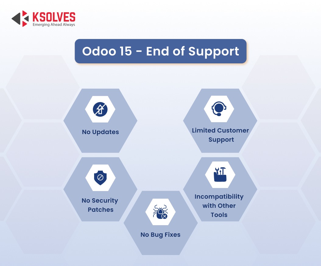 With no new updates and features, Odoo 15 may now become incompatible with other business tools. This may result in limited functionality of your Odoo ERP.