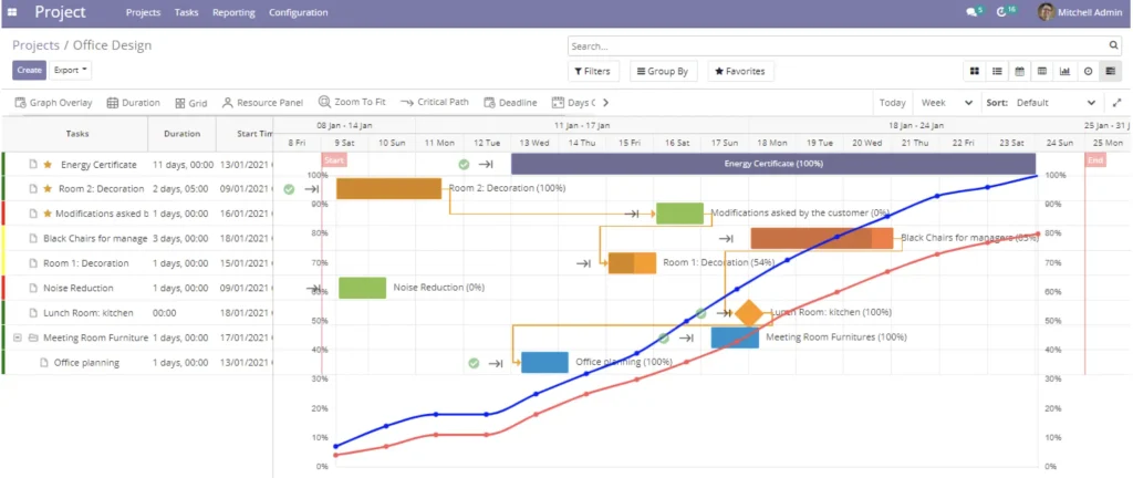 The Gantt View Project application for Odoo helps a user to check all the details associated with that project. For example, a user can assign and modify the task deadline, check which employee is working on which project, create a project, and do many more tasks.