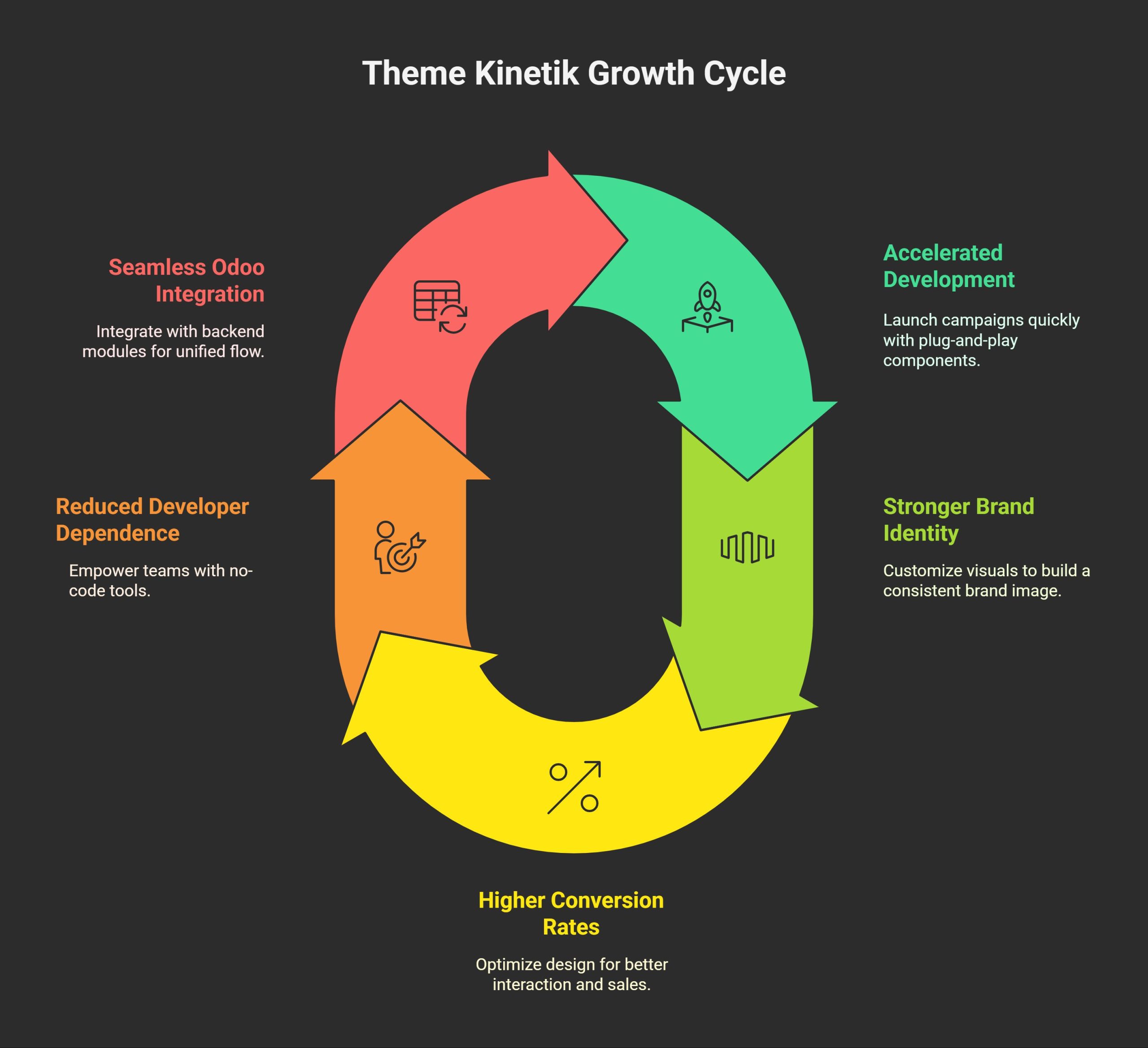 Launch new campaigns, offers, or product lines without long development cycles. Thanks to its plug-and-play components and visual editor, Theme Kinetik helps businesses reduce their time to market dramatically. This makes it one of the most agile Odoo theme for eCommerce platforms available.