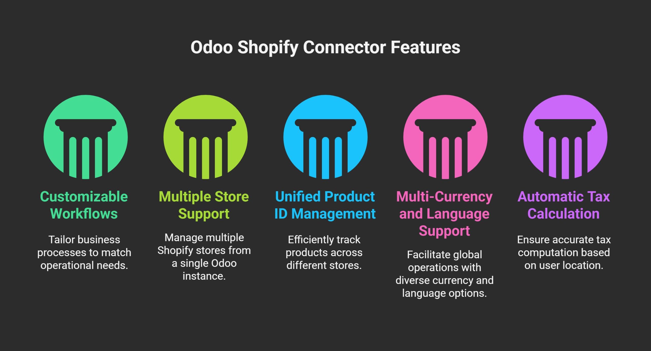 The Odoo Shopify Connector provides multiple technical features and capabilities that improve functionality and usability. Its advanced features include: