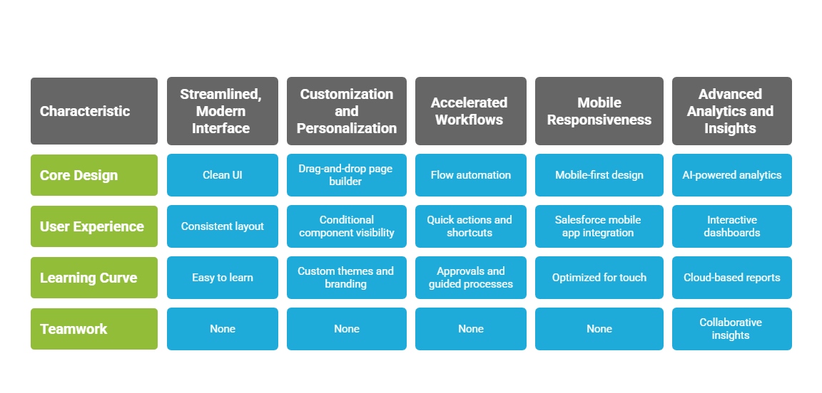Salesforce Lightning Experience replaces the old Classic UI with a modern, user-friendly design. Key features include: