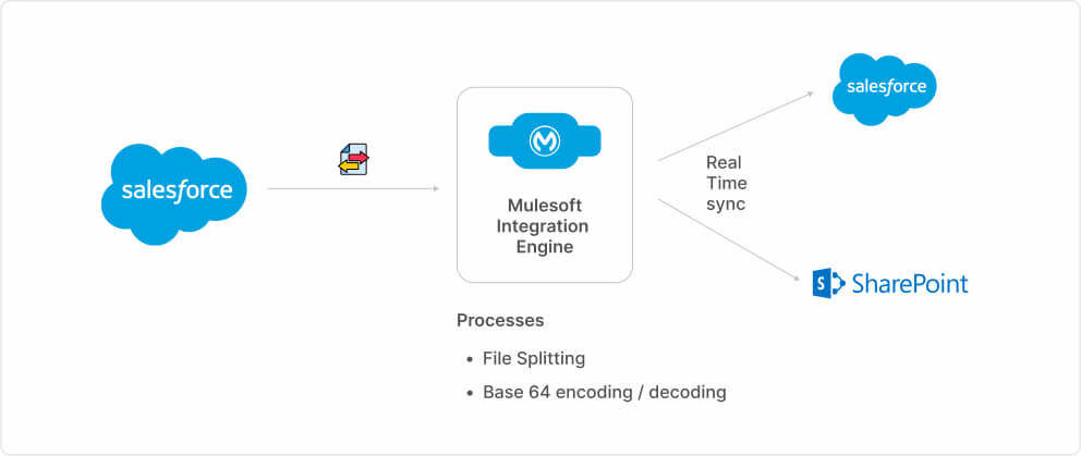 The client approached us with the requirement to implement real-time data synchronization between multiple Salesforce systems. Also, they wanted to migrate their existing data to establish continuous and real-time synchronization across these systems. Their key aim was to create an efficient and reusable solution that enables real-time file and data transfers across the various platforms while resolving the issue of size limitations in the file transfers.