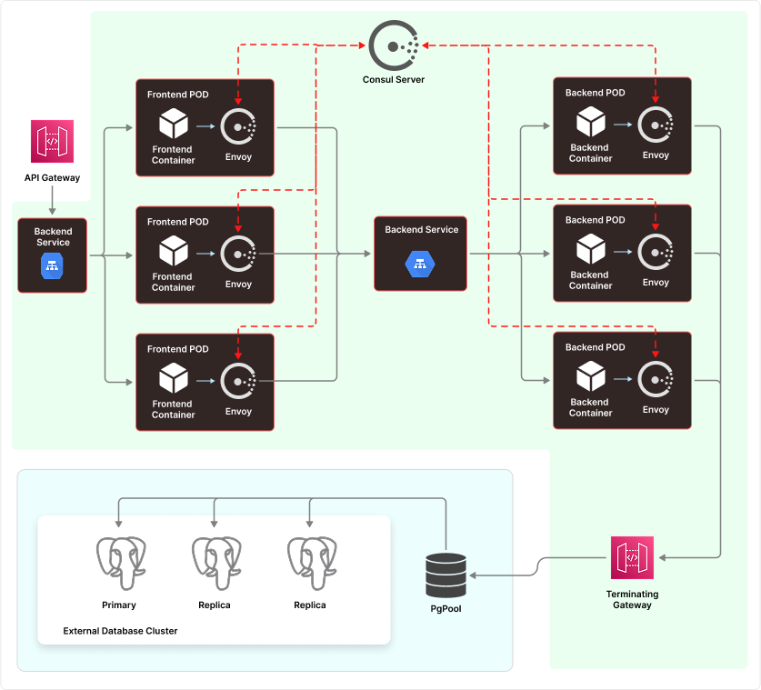 • Hybrid Architecture Support: Consul’s Mesh Gateway connected Kubernetes clusters with VM-based PostgreSQL databases, ensuring seamless and secure hybrid connectivity across environments.